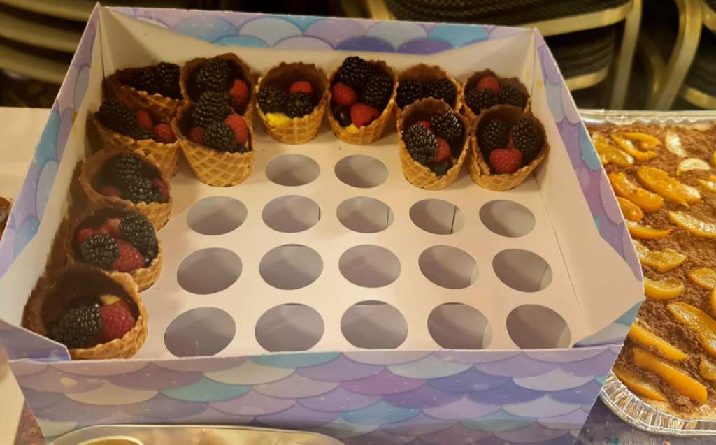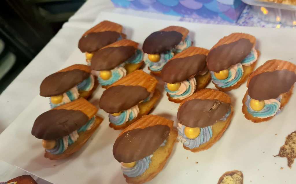 For the desserts, we had a sweet selection that tied perfectly into the theme. Of course, the centerpiece was the birthday girl’s main cake. We also made cupcakes using a simple box mix to save time, topped them with frosting, and added candy decorations that matched the sea and mermaid vibe. We gave store-bought madeleines a fun twist too—turning them into little “clam shells” with a candy pearl inside. I also made pastel-colored chocolate mousse, carefully layered and served in sealed containers for an extra pop of color. And of course, we brought back last year’s crowd favorite: the berry cones. This time, we improved them by lining the inside of the cones with chocolate before adding the custard and berries, helping to keep them crisp and even more delicious. And to round it all out, I made a refreshing peach float, which was a light, creamy dessert that everyone loved.