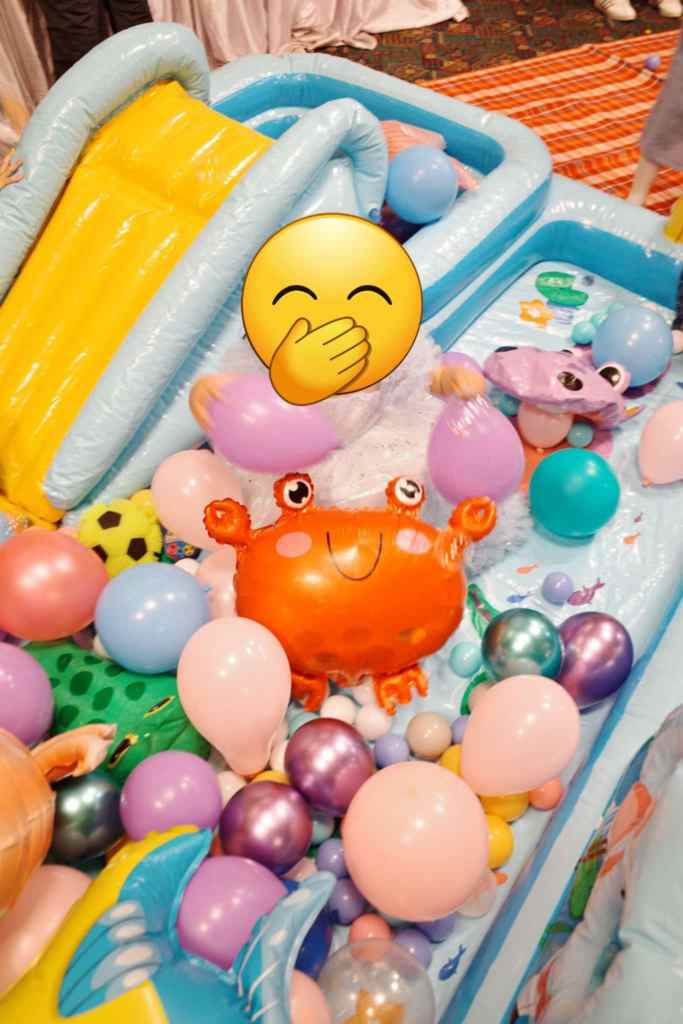 When it came to entertainment, we wondered at first whether we should organize some party games. But since most of the children attending were toddlers, we decided it would be better (and easier!) to set up a dedicated play area instead. To match the under-the-sea theme, we brought out my daughter’s mini swimming pool with a slide, filled it with soft play balls, and added some sea animal balloons for extra fun. We even set up a bubble machine on the side, which added a magical, ocean-like atmosphere that the little ones absolutely loved.